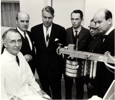 第一次血管通路手術(shù)發(fā)生在1948年,尼爾斯Nils Alwall(1904-1985)(左一)和萊納特?奧斯特格林(Lennart ?stergren)(左四),在瑞典名校隆德大學(xué)對(duì)轉(zhuǎn)鼓人工腎進(jìn)行了改進(jìn),使其能通過(guò)負(fù)壓進(jìn)行超濾。但由于各種并發(fā)癥,1949年被迫停止了該類手術(shù)。