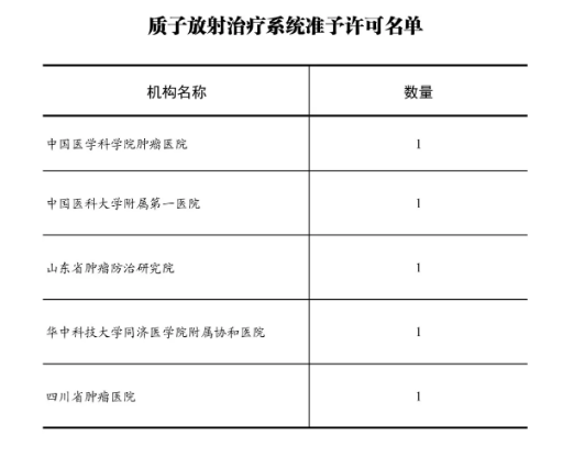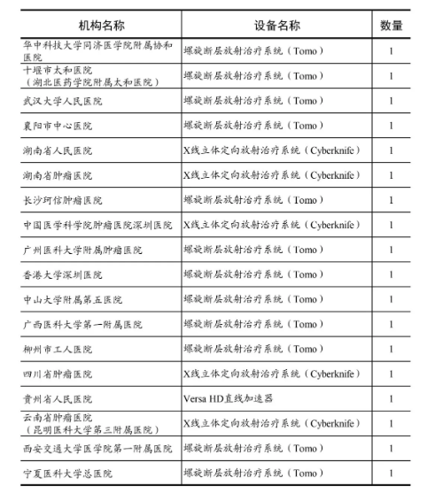 近日,國家衛(wèi)生健康委員會(衛(wèi)健委)發(fā)布了《關(guān)于2019年甲類大型醫(yī)用設(shè)備配置許可的通告》(以下統(tǒng)稱“通告”),通告中公布了已取得質(zhì)子放射治療系統(tǒng)、正電子發(fā)射型磁共振成像系統(tǒng)(PET/MR)、高端放射治療設(shè)備(包括X線立體定向放射治療系統(tǒng)(英文簡稱Cyberknife)、螺旋斷層放射治療系統(tǒng)(英文簡稱Tomo)HD和HDA兩個型號、Edge和Versa)配置許可證的醫(yī)院名單。