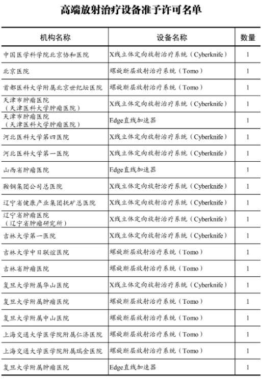 根據(jù)通告,此次獲得配置許可證的甲類大型醫(yī)用設(shè)備包括:質(zhì)子放射治療系統(tǒng)5套,正電子發(fā)射型磁共振成像系統(tǒng)(PET/MR)28臺,高端放射治療設(shè)備58臺(Edge直線加速器 4臺、Versa HD直線加速器4臺、X線立體定向放射治療系統(tǒng)(Cyberknife)21臺、螺旋斷層放射治療系統(tǒng)(Tomo)29臺)。