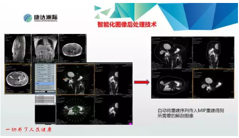 康達(dá)“智速”磁共振采用的智能化圖像后處理技術(shù)無(wú)需人工干預(yù),自動(dòng)將重建序列傳入MIP重建得到所需要的解剖圖像。在AI技術(shù)助力下,能完成五期動(dòng)態(tài)增強(qiáng),單期掃描時(shí)間僅需15秒。