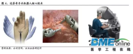 達(dá)芬奇手術(shù)機(jī)器人代表著當(dāng)今手術(shù)機(jī)器人最高水平,它有三個(gè)關(guān)鍵核心技術(shù):可自由運(yùn)動(dòng)的手臂腕部Endo Wrist、3D高清影像技術(shù)、主控臺(tái)的人機(jī)交互設(shè)計(jì)。