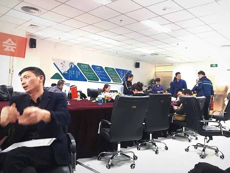 (2018年4月10日10時36分,來自各地的代理商聚集在遠(yuǎn)程視界辦公區(qū)內(nèi),要求退還代理費。攝影/《財經(jīng)》記者 張利)