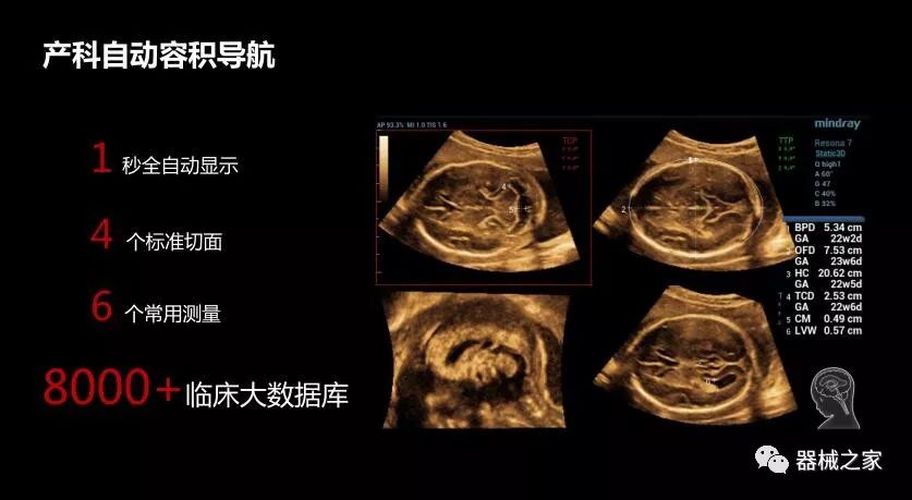 基于臨床大數(shù)據(jù)算法,女媧Resona 8在取得胎兒顱腦三維數(shù)據(jù)后,1秒的時(shí)間就可以直接顯示4個(gè)標(biāo)準(zhǔn)切面并進(jìn)行6個(gè)常用的測量。