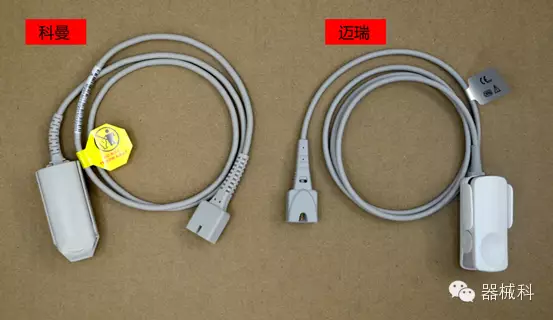 兩家使用的血氧探頭有明顯的區(qū)別??坡目瓷先ジ~瑞的設計看起來新超大氣,顏色更白。不知道用久了,會不會發(fā)黃變色??戳艘幌绿筋^的發(fā)光管和接收管,居然是一樣的,從發(fā)光管和接收管的外形上看用的都是OSI的,看來在這一點上大家都比較認可這家頂級老牌生產(chǎn)的管子。用手指感受了一下兩家的探頭,邁瑞的選用的材料比較柔軟,在感受上比較舒適,科曼的探頭襯墊手感上要硬朗一些,不過也不會有任何的不適。