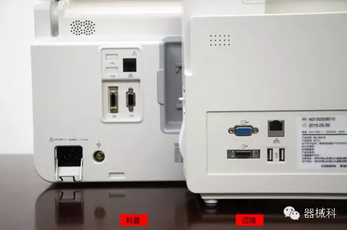 兩家都采用目前比較普遍的DB9插頭的轉(zhuǎn)接方式??坡@得沉穩(wěn),線體粗壯,線上還加了磁環(huán),抗干擾能力更強。邁瑞看起來簡潔新潮,用起來更柔軟,不知道是不是為了不影響美觀才沒有設計磁環(huán)呢?