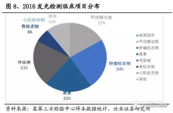 在發(fā)光檢驗終端分布中,有醫(yī)院、血站、獨立實驗室、體檢中心和防疫站等,90%以上在醫(yī)院。