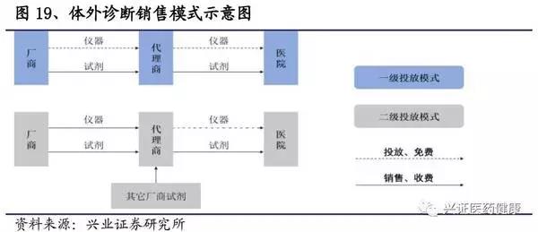 醫(yī)院是產(chǎn)業(yè)鏈上最強勢的一環(huán),國產(chǎn)產(chǎn)品對醫(yī)院的吸引力決定著國產(chǎn)替代進程。在銷售模式上,公司多采用直銷和經(jīng)銷相結(jié)合,以經(jīng)銷為主。對于醫(yī)院終端,儀器基本以投放獲得,廠商以搭配銷售試劑的方式獲得收益。體外檢測等醫(yī)療服務(wù)由政府統(tǒng)一定價,應(yīng)用化學(xué)發(fā)光法可相應(yīng)提高收費標準(例如:福建省用化學(xué)發(fā)光法可加價80%)。因此,試劑屬于醫(yī)院的“成本項”,醫(yī)院有動力對檢測方法進行升級迭代,但卻并沒有動力去特意抬高價格,在相同條件下會考慮試劑性價比,相對市場化。
