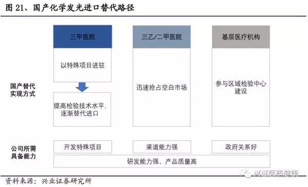 對于三甲醫(yī)院,其技術(shù)偏好較高,從目前的市場反應(yīng)來看,國產(chǎn)發(fā)光儀器和試劑的精確性和穩(wěn)定程度仍不能達到三甲醫(yī)院的要求。同時三甲醫(yī)院多有聲譽追求,對進口品牌的忠誠度高。在價格上,樣本量大、檢驗結(jié)果質(zhì)量要求高、檢驗人員成本高致使其相對價格不敏感。而國內(nèi)廠家對于試劑的研發(fā)仍停留在檢測項目的拓展上,基于現(xiàn)狀,大規(guī)模進口替代較難實現(xiàn)。有些特殊項目未涉及,如藥物濃度檢測等,可作為突破口進駐高端醫(yī)院,建立品牌形象??傮w來說,短期內(nèi)國內(nèi)廠商可依靠特殊項目檢查可獲得三級醫(yī)院小部分份額,長期來看,想進駐高端醫(yī)院并獲得主力項目的份額,須加大研發(fā)投入,做好做精發(fā)光試劑,打破醫(yī)院對于國產(chǎn)山寨的慣性認知。