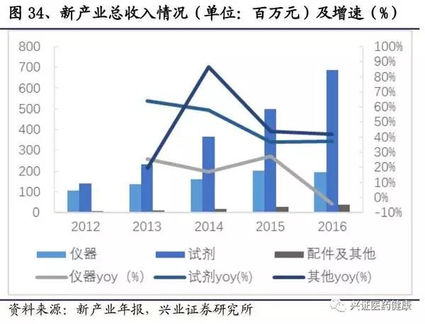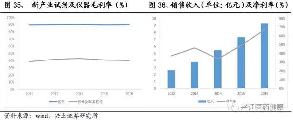 新產(chǎn)業(yè)2016年總收入9.23億元,絕大部分為發(fā)光產(chǎn)品,2012-2016年,新產(chǎn)業(yè)收入復(fù)合增速保持在37%左右。其中試劑增速較高,保持在35%以上,隨著儀器投放的增加,試劑的增速將會上升。由于近幾年空白市場將逐漸被消化,儀器的增速將呈現(xiàn)下降的態(tài)勢。