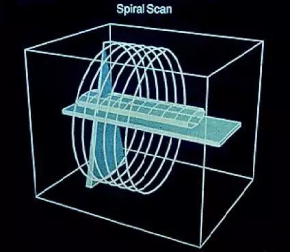 在治療之前,先由KVCT對病人進行斷層掃描,根據(jù)此掃描圖像由治療計劃系統(tǒng)進行逆向治療計劃設計,即各個角度束流形狀及流強分布設計;也既計算出在治療環(huán)每一個旋轉(zhuǎn)角度和治療床前進的每一個位置上的多葉準直器各個葉片的確切位置。然后打開加速器,用MVCT再核準病灶位置;如有錯位,預先進行調(diào)節(jié);在治療過程中,治療環(huán)旋轉(zhuǎn)和治療床勻速前進,進行螺旋照射,見圖(2)