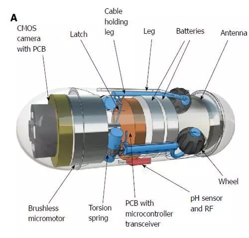 它配有3個(gè)微型腿,每個(gè)腿都帶有一個(gè)輪子。這些腿伸出和縮回得益于微電機(jī)和三個(gè)定做扭力彈簧。通過記錄它們執(zhí)行的每個(gè)旋轉(zhuǎn),車輪專門設(shè)計(jì)用作微型里程表。當(dāng)Odocapsule穿過小腸時(shí),輪子轉(zhuǎn)動(dòng)并且它們的旋轉(zhuǎn)被轉(zhuǎn)換到裝置覆蓋的距離,從十二指腸進(jìn)入點(diǎn)到每個(gè)感興趣的區(qū)域/點(diǎn)。