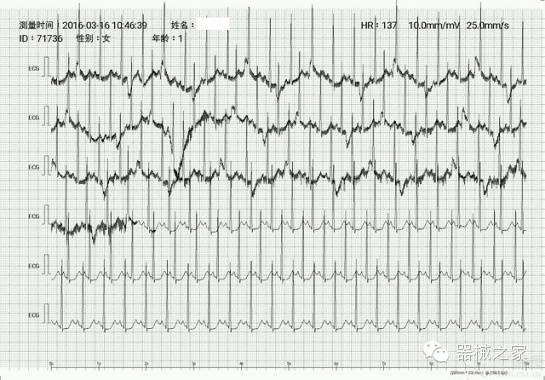 3、關(guān)于抗干擾能力,對于只有兩個電極沒有地線的情況下,對這個機器的要求真的不能太高?;€干擾和不穩(wěn)定是經(jīng)常的,所以需要測試人配合安靜勿動。測試1描測的心電圖除了只有一個導(dǎo)聯(lián)的限制之外,基本可以滿足各項心電圖數(shù)據(jù)的測量。測試2和3都是處于深度鎮(zhèn)靜氣管插管的小兒,出現(xiàn)兩個問題:1.小兒腹軟且腹部動度較大導(dǎo)致呼吸波干擾明顯,所以建議把左下腹電極片貼到左髂部或左股部外側(cè);2.基線干擾更加明顯,這時本人手握患兒左下肢后基線干擾消失,對心電記錄波形沒有產(chǎn)生明顯影響。
