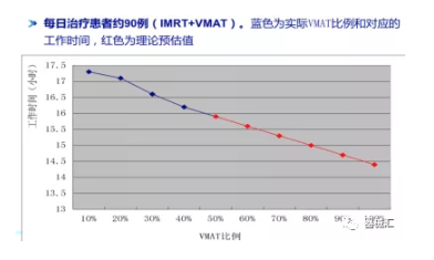 需要說明的是,有些技術本身并不是為了加快治療速度而發(fā)展起來的,例如,大分割放療技術,其發(fā)展的本質(zhì)是基于其生物效應優(yōu)勢。但是我們不能否認,該技術的發(fā)展確實減少了定擺位的累計次數(shù)和時間,等于是減少了整個的治療時間,有利于在同樣多的時間里可以治療更多的患者。同樣,多采用VMAT技術,和普通IMRT相比,也能減少工作時間。如下圖所示:
