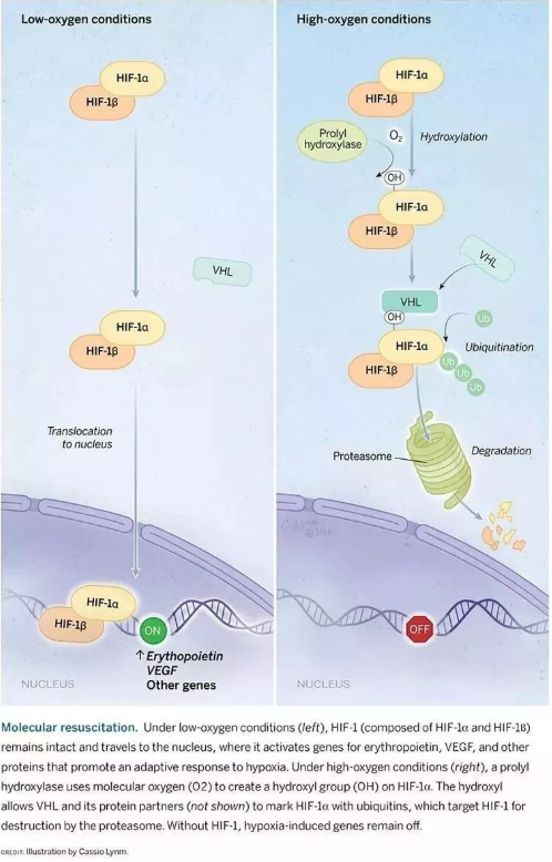 獲獎?wù)咧坏腟emenza教授在培育的肝細(xì)胞中發(fā)現(xiàn)了一種蛋白質(zhì)復(fù)合物以一種氧依賴性的方法與已判定出的 DNA 片段結(jié)合,開啟某些基因的表達(dá)。他稱這種復(fù)合物為缺氧誘導(dǎo)因子(HIF),是一個轉(zhuǎn)錄因子。HIF蛋白在低氧氣濃度時會積累,使細(xì)胞開啟應(yīng)對低氧環(huán)境的系列基因表達(dá);而在氧氣濃度高的時候,HIF會發(fā)生羥基化,然后該因子被泛素蛋白酶體系統(tǒng)降解。如此,細(xì)胞可以通過感知氧氣并對HIF的調(diào)節(jié),實現(xiàn)對細(xì)胞中基因表達(dá)的控制,來應(yīng)對機(jī)體氧含量的變化。經(jīng)研究發(fā)現(xiàn) HIF 由兩種不同的 DNA 結(jié)合蛋白組成(即所謂的轉(zhuǎn)錄因子,現(xiàn)在稱為 HIF-1α和 ARNT)。
