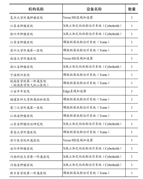 根據(jù)通告,此次獲得配置許可證的甲類大型醫(yī)用設(shè)備包括:質(zhì)子放射治療系統(tǒng)5套,正電子發(fā)射型磁共振成像系統(tǒng)(PET/MR)28臺,高端放射治療設(shè)備58臺(Edge直線加速器 4臺、Versa HD直線加速器4臺、X線立體定向放射治療系統(tǒng)(Cyberknife)21臺、螺旋斷層放射治療系統(tǒng)(Tomo)29臺)。