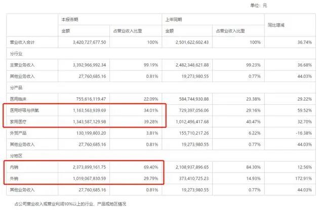 根據(jù)半年報,公司產(chǎn)品主要集中在醫(yī)用呼吸與供氧、家用醫(yī)療等領(lǐng)域,這兩項產(chǎn)品占比超過7成,且業(yè)務(wù)主要在境內(nèi)進行。所以真正能夠決定公司未來常態(tài)化業(yè)績表現(xiàn)的,不是外貿(mào)產(chǎn)品,也不是海外訂單。
