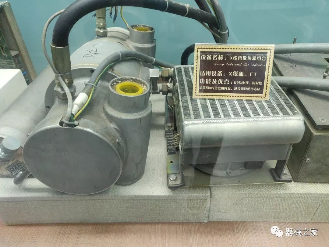 由于X線機(jī)產(chǎn)生X射線的過程中只有百分之一的動能轉(zhuǎn)化為X射線,其余的能量都以熱能的形式散失。這就需要良好的散熱設(shè)備,也就是這個(gè)散熱器。散熱器大多采用油冷。變壓器油不僅絕緣,而且能夠吸收散亂射線,防止擊穿。使用時(shí),一般會用油泵將冷油泵入到球管周圍,將熱油從另一管導(dǎo)出,在冷卻板上冷卻,循環(huán)利用。