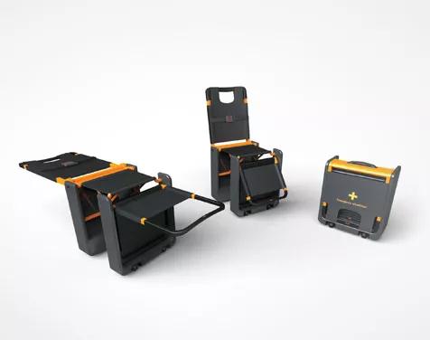 EMERGENCY WHEELCHAIR是一種用于緊急狀態(tài)下的輪椅,可用于運送生病或受傷的火車乘客。使用時,僅需要按下按鈕,便可抬起一個手柄成為輪椅的后部,然后伸展設備的主體以形成座椅結構,輪椅的結構形成,鎖定點以保護整個結構。當存放輪椅時,可以將椅子的主體和椅背折疊成緊湊的盒子。