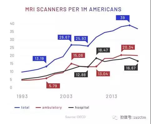 到2016年,平均每1千名美國(guó)人大約接受了121次MRI掃描檢查。而在加拿大和澳大利亞,這一數(shù)字分別是56和43次。最近的觀點(diǎn)是MRI是美國(guó)過(guò)于昂貴的醫(yī)保支付系統(tǒng)的終極力證。成為了拖垮美國(guó)醫(yī)保費(fèi)用的“原罪”之一。