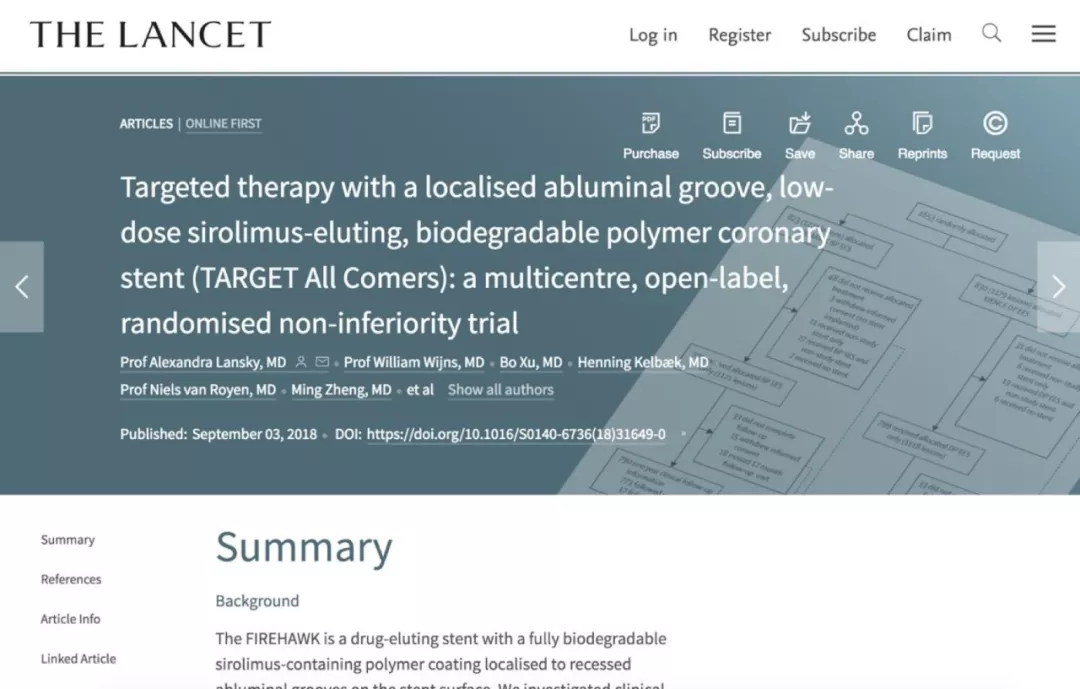 2018年9月,一項(xiàng)由10個國家和地區(qū)21家機(jī)構(gòu)聯(lián)合參與的一項(xiàng)大型臨床試驗(yàn)成果,首次刊登在《柳葉刀》上,這項(xiàng)試驗(yàn)證實(shí):中國自主研發(fā)的心臟冠脈藥物洗脫支架“火鷹”(FIREHAWK),使用了最少的藥劑量,因而獲得了最高的安全性,而同時在療效上與國際頂尖的XIENCE支架媲美。