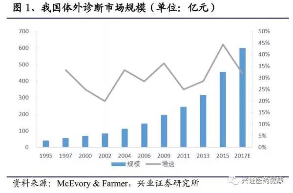 我國體外診斷行業(yè)相較于歐美市場,起步較晚,但發(fā)展快速,2015年,我國IVD市場規(guī)模達450億,預(yù)計2017年市場容量有望擴增至600億。