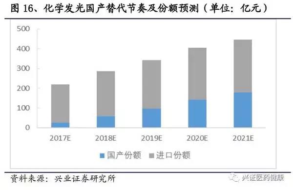 目前,化學(xué)發(fā)光行業(yè)以25%-30%的增速增長,現(xiàn)國內(nèi)企業(yè)已突破技術(shù)壁壘,進入銷售放量階段,參考生化替代的節(jié)奏,5年內(nèi)可占有近一半的市場份額。預(yù)計在2021年,國內(nèi)廠家可總共占有百億以上的市場份額。