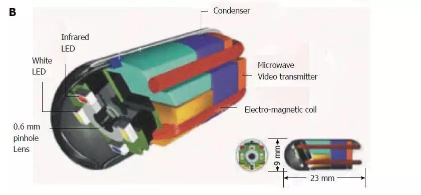 膠囊內(nèi)鏡的尺寸為9 mm×23 mm,0.6毫米彩色鏡頭和410000像素電荷耦合設(shè)備相機(jī)可以獲得高達(dá)每秒30幀(fps),只需患者穿著將微波傳輸?shù)侥z囊的背心。兩個(gè)罐與閥定位在中心和一個(gè)有用于存儲(chǔ)電力以及微波視頻信號(hào)發(fā)射機(jī)。在相機(jī)鏡頭周圍,放置了四個(gè)白色LED和用于調(diào)焦的磁線圈。更重要的是,40%的體積是自由空間,可用于手術(shù)目的,如藥物噴霧,激光治療,pH傳感等。雖然這種膠囊已經(jīng)在網(wǎng)上描述了十多年,至今仍沒有對(duì)這種膠囊進(jìn)行人體實(shí)驗(yàn)。