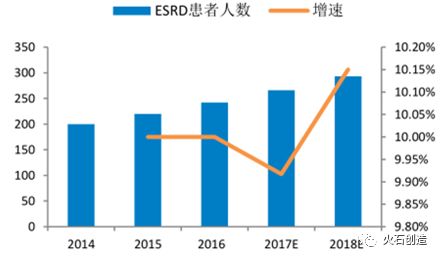 慢性腎病發(fā)展到5期,就進(jìn)入了終末期腎病階段,隨著腎功能的下降,最終引發(fā)尿毒癥的各種癥狀。據(jù)統(tǒng)計(jì),2014年和2015年我國(guó)終末期腎病患者人數(shù)分別達(dá)到200萬(wàn)人和220萬(wàn)人,預(yù)計(jì)2018年將達(dá)到293萬(wàn)人,四年復(fù)合年增長(zhǎng)率達(dá)到10.02%。