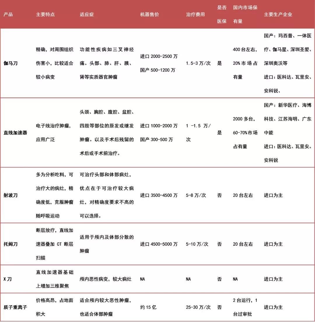 目前的放射治療技術(shù)包括伽瑪?shù)丁⑸洳ǖ?、托姆刀、質(zhì)子重離子、EDGE(速鋒刀)無創(chuàng)手術(shù)系統(tǒng)。各技術(shù)的特點(diǎn)如下。